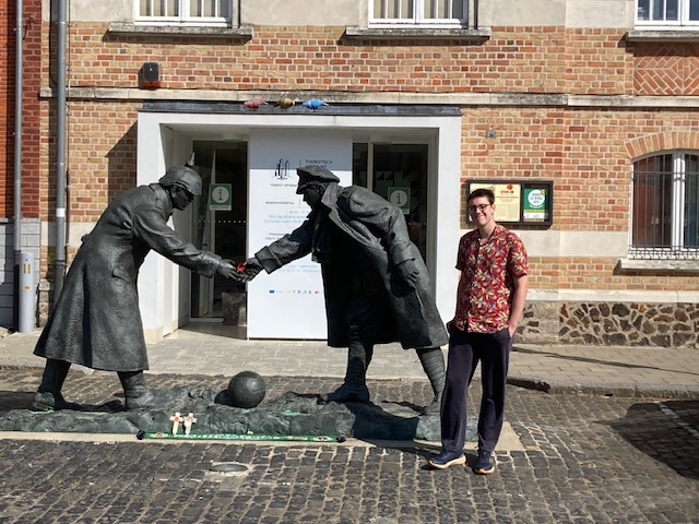 We ended the day having a great meal in a restaurant called the Captain Cook (always appealing to those of us with Middlesbrough connections). Milo had an epic calzone, I tucked into the chicken in mushroom sauce followed by the (inevitable) Belgian waffle. We fell into conversation with diners on the next table from Malton, who tipped us off about the site of the 1914 Christmas truce, maybe 15 minutes’ drive from town. That decided our first stop on Saturday.