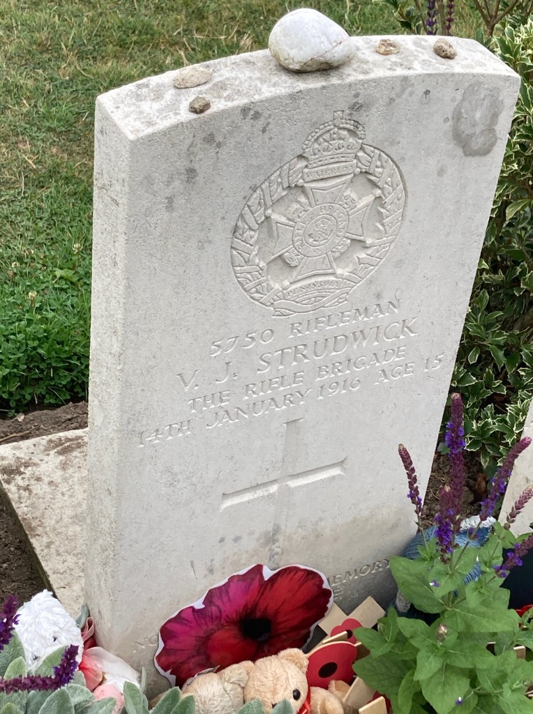 First stop was the Essex Farm cemetery. It was a poignant place to start. After a brief outline of the war’s beginnings, we walked over to the grave of Valentine Strudwick, at 15, the British Army’s youngest casualty. Boys this age enlisting was not uncommon, but this death caused an outcry by parents for their sons to be found and returned to the UK. A search was made, and eligible boy soldiers were told they could return without penalty. Many, however, resisted, feeling it would be letting down their comrades to go back home.