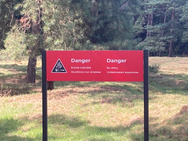 Vimy Ridge was the last, and in many ways the most impressive, of all the memorials we visited. It stands on high ground with extensive views over the surrounding countryside (and a few coal heaps). The battle took place in 1917, and Canadian forces, working together at last, conquered the ridge that had defied many previous attempts by the Allies. One attempt was by the French Moroccan regiment, who in 1915 dislodged the Germans from the crest, but had to withdraw when reinforcements failed to arrive. They have a memorial nearby also: I’ve learned that many of these troops were in fact Senegalese, which may account for the colourfully dressed African women whose photo I took on our visit.. We’d left the car in a car park maybe 800 yards from the ridge’s edge itself. The way to the monument was clear, a straight walk across mown grassland. Milo would have preferred to approach through the battle area, where shell holes and defensive positions were still evident, and trees provided shade on a hot day. This wasn’t possible. As we got nearer the monument, that way was prevented by electric fences, and regular notices warning that the ground was still full of unexploded ordnance.